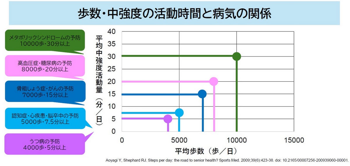 例えば、1日4,000歩、かつ5分以上の中強度活動を行うと、うつ病を予防できるという研究結果が出ています。メタボリックシンドロームの予防にはさらに努力が求められますが、着実に効果は現れるそうです。
