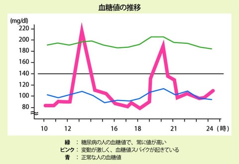 食後、血糖値が急上昇・急降下することで血管へダメージを与えたり、糖尿病のリスクが高まる「血糖値スパイク」に注意しましょう(グラフのピンク線)。困ったことに血糖値スパイクは、空腹時血糖値やHbA1cは正常範囲であることが多いため、検査でも見過ごされやすいそう。