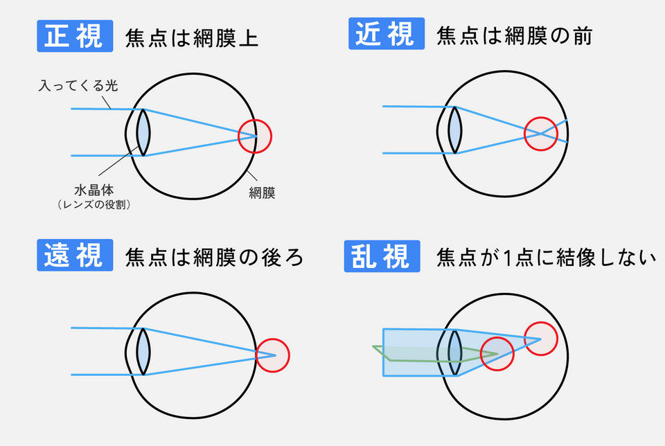 屈折異常とは主に、ピントが眼内の適正な位置(以下、正視)からズレることで起こります。