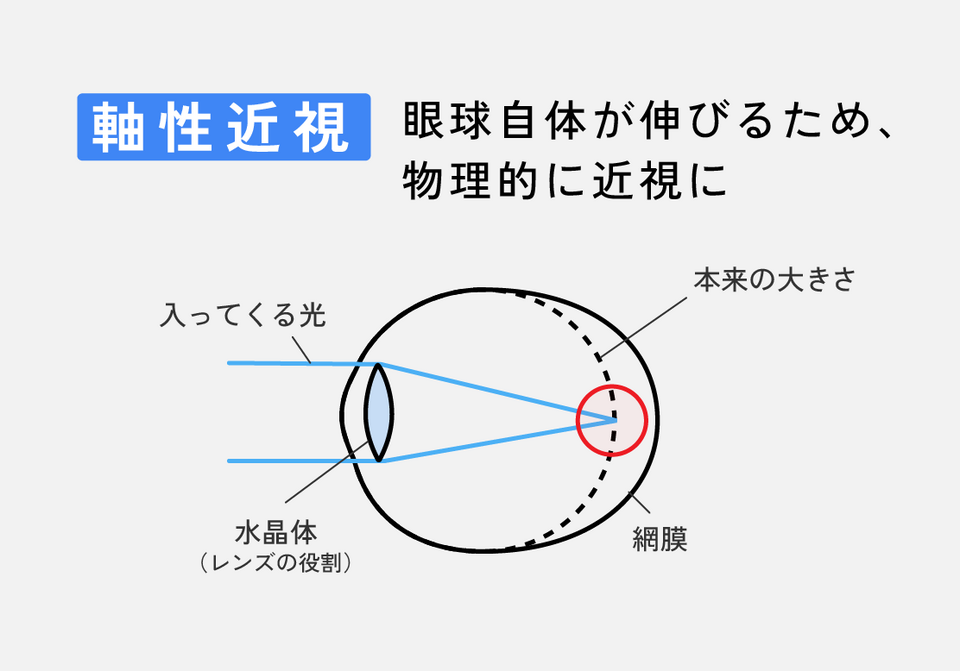 ところが、近くを見るという環境へ適応するために、「軸性近視」という眼球の長さが伸び物理的に近視になる症状があります。