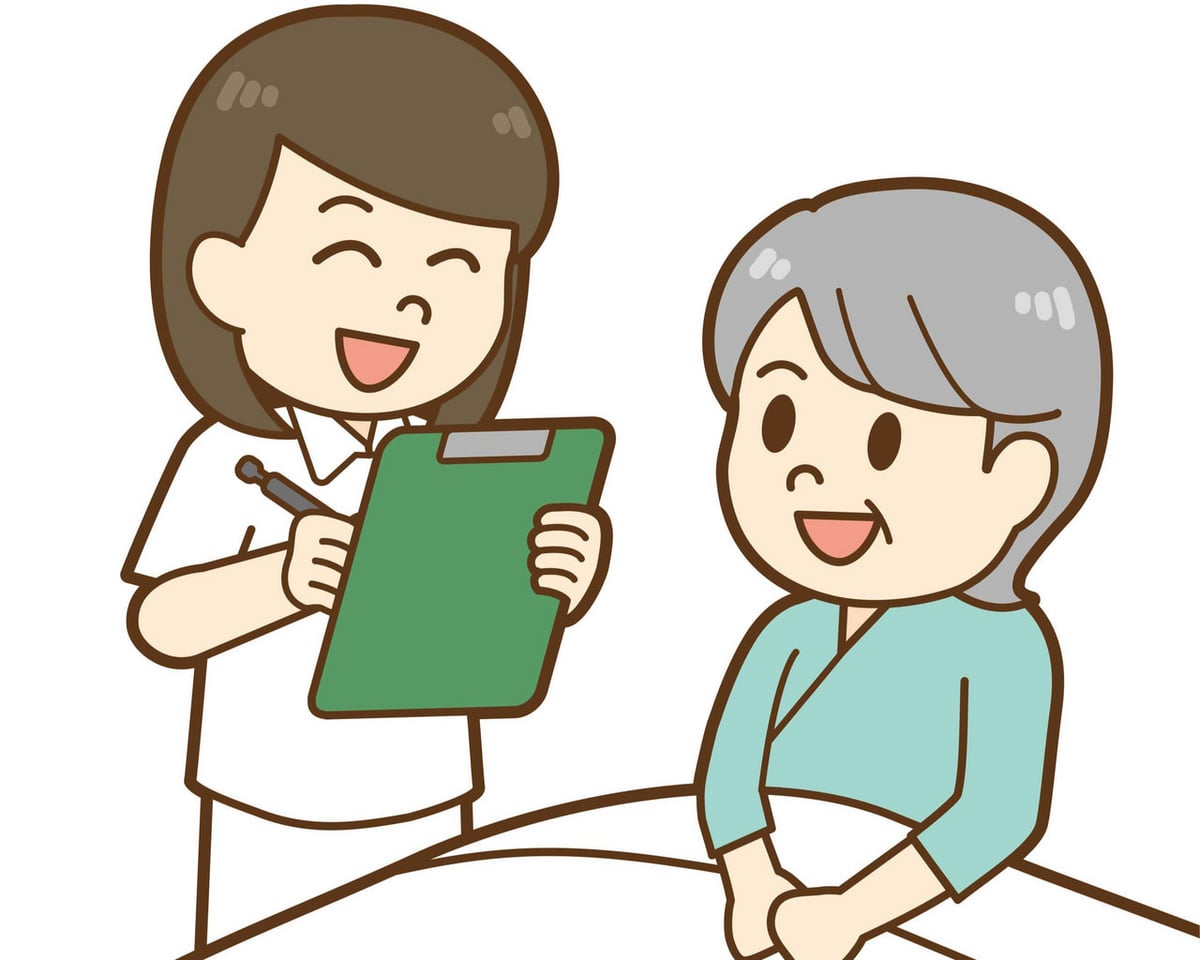 患者さんを驚かせないよう、正面から近づき、目を合わせて優しく声をかけ、手の甲など見える部位にそっと触れる。
